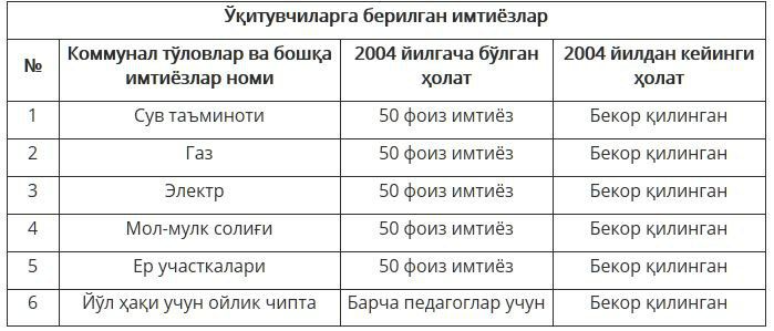 Мисол учун, 2000 йилларда ўқитувчилар учун бир қанча имтиёзлар бўлган экан. Ўша йиллари педагогларга нисбатан газ, сув, электр энергияси, ер-мулк солиғи учун 50 фоизгача чегирма белгиланган экан.