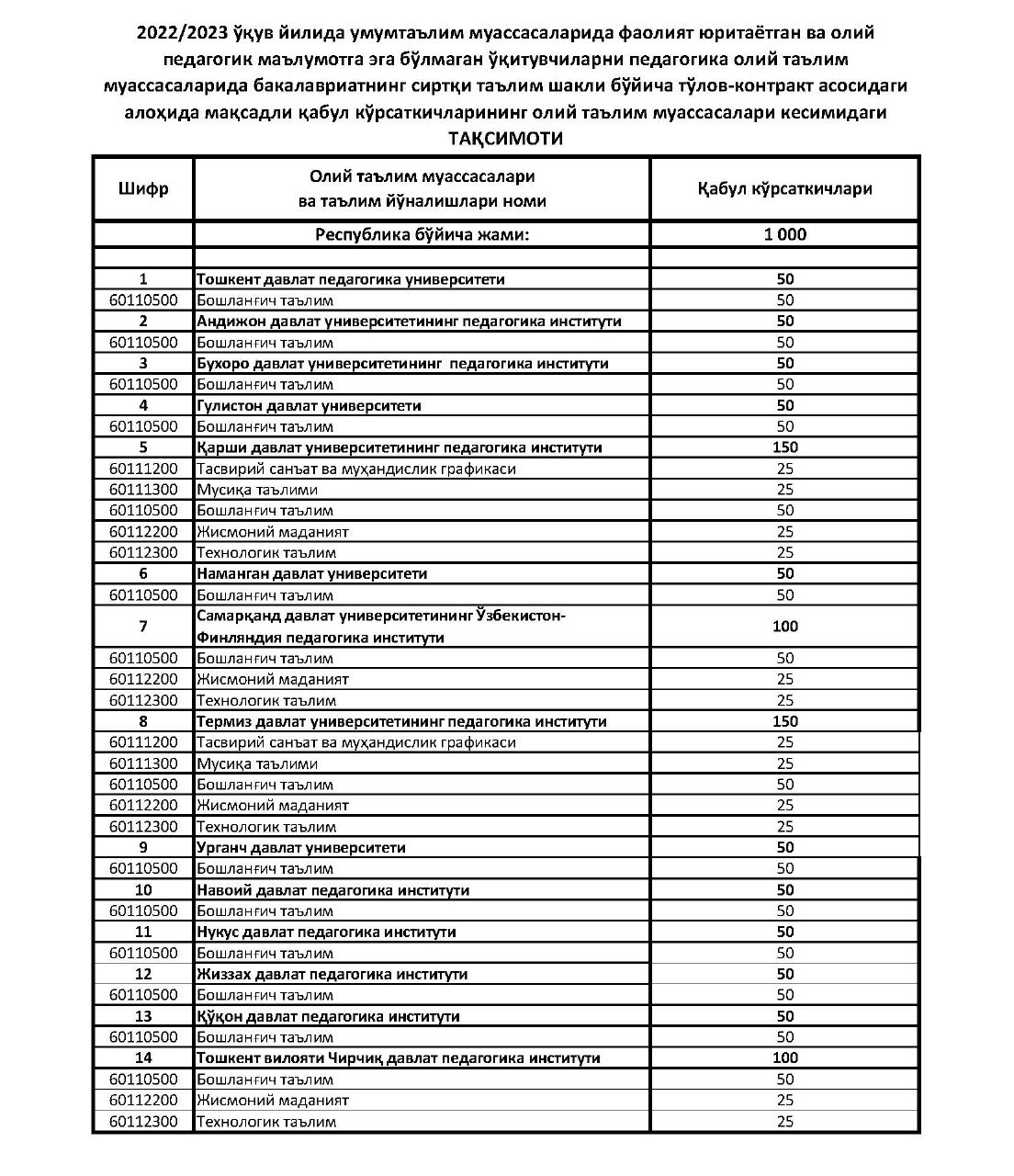 Давлат қабул комиссиясининг 1-сон баёни билан 2022-2023-ўқув йилида умумтаълим муассасаларида фаолият юритаётган ва олий педагогик маълумотга эга бўлмаган ҳамда камида 5 йил педагоглик стажига эга бўлган ўқитувчилар учун педагогика ОТМларида бакалавриатнинг сиртқи таълим шакли бўйича тўлов-контракт асосида алоҳида мақсадли қабул кўрсаткичларининг олий таълим муассасалари кесимидаги тақсимоти тасдиқланди.