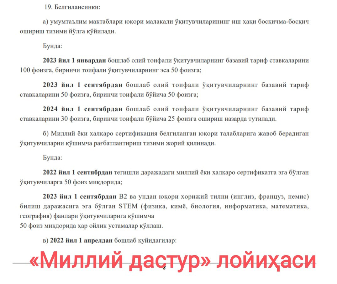 ❕Аммо мазкур фармон имзоланишдан аввал ўқитувчилар ойлик маошини ошириш тўғрисидаги банди Миллий дастурдан чиқариб ташланган. Кейинроқ эса яъни 2022 йил 11 майда Президент томонидан мазкур Миллий дастур тасдиқланган.