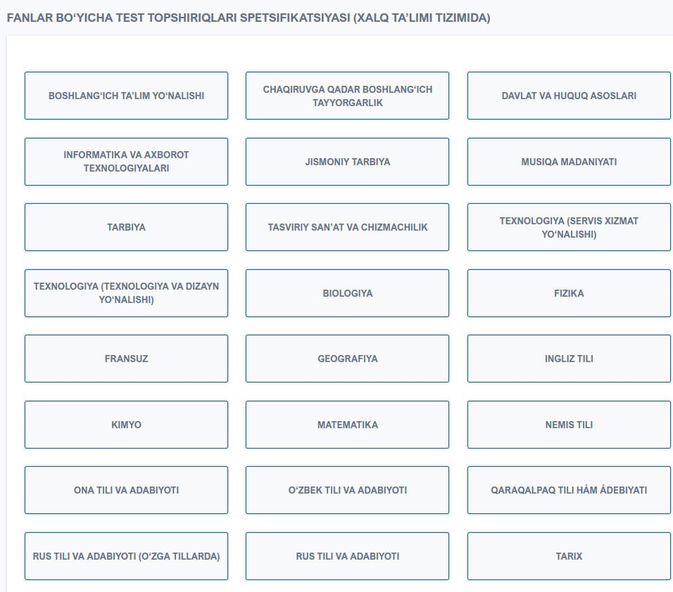 Номзодларнинг дарс берадиган умумтаълим фани бўйича ўтказиладиган тест синовлари учун фанлар спецификацияси эса Давлат тест маркази томонидан эълон қилинди.