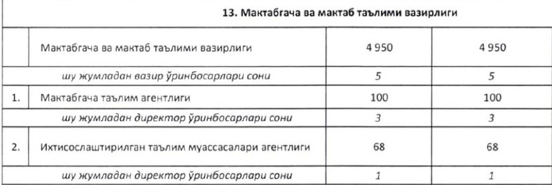 Умуман олиб қараганда, бутун республика бўйича бошқарув ходимларининг сони 4 минг 950 та этиб белгиланганлиги тизимда жуда катта қисқариш бўлиши мумкинлигидан далолат бермоқда.