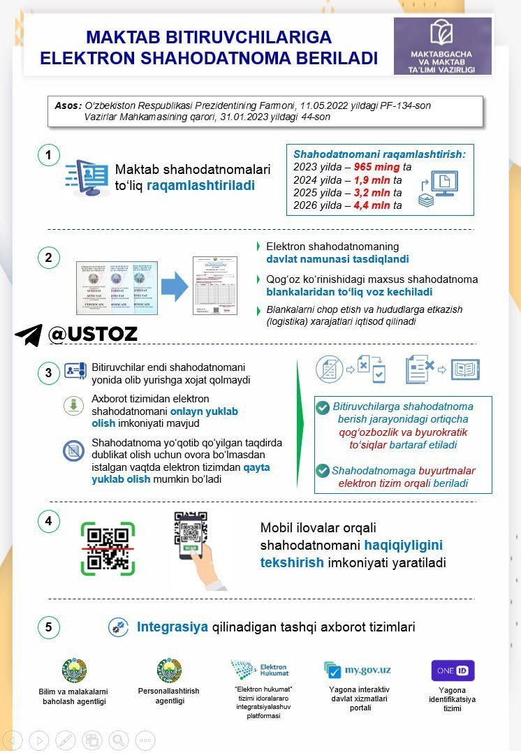 ⚡️2022-2023-ўқув йилидан мактаб битирувчиларининг шаҳодатномалари электрон шаклда берилади