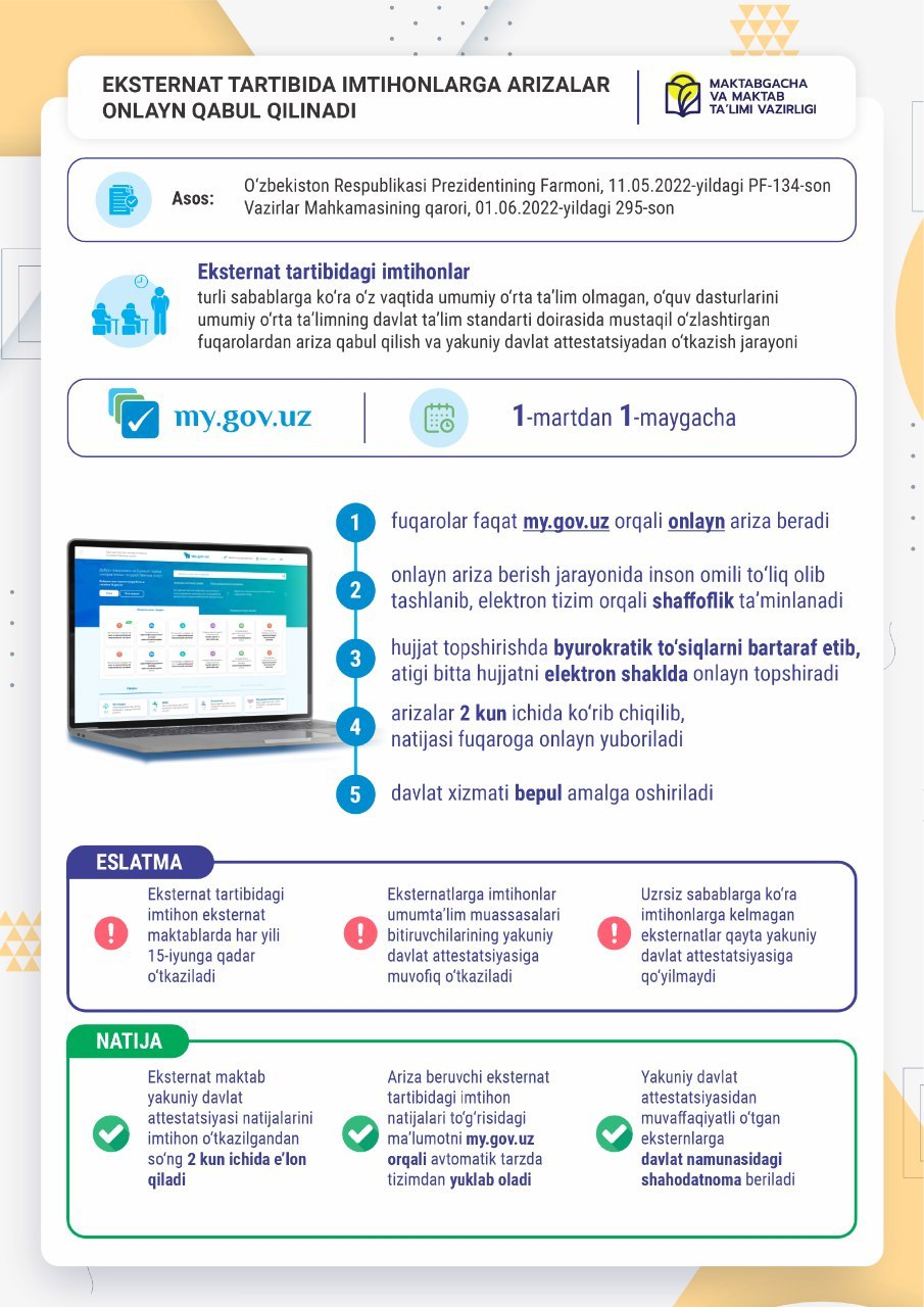 ⚡️Эндиликда экстернат тартибида имтиҳон топширишда ариза бериш учун мактабга боришнинг ҳожати йўқ