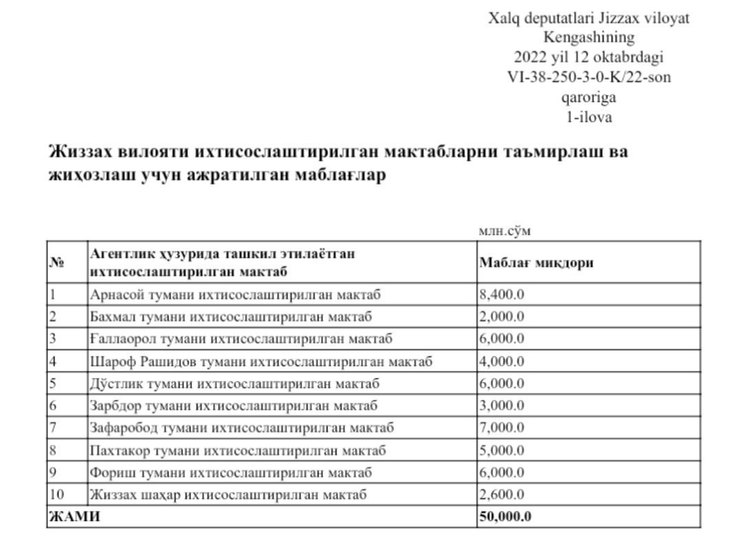 Мисол учун, Жиззах вилоятидаги ихтисослаштирилган мактабларда амалга ошириладиган таъмирлаш ва жиҳозлаш ишлари учун “Миллий банк”дан 12 ойгача бўлган муддатга, йиллик 20 фоиз ставкада, чораклик тўловлар орқали қайтариш шарти билан 50 млрд сўм кредит ажратилган.