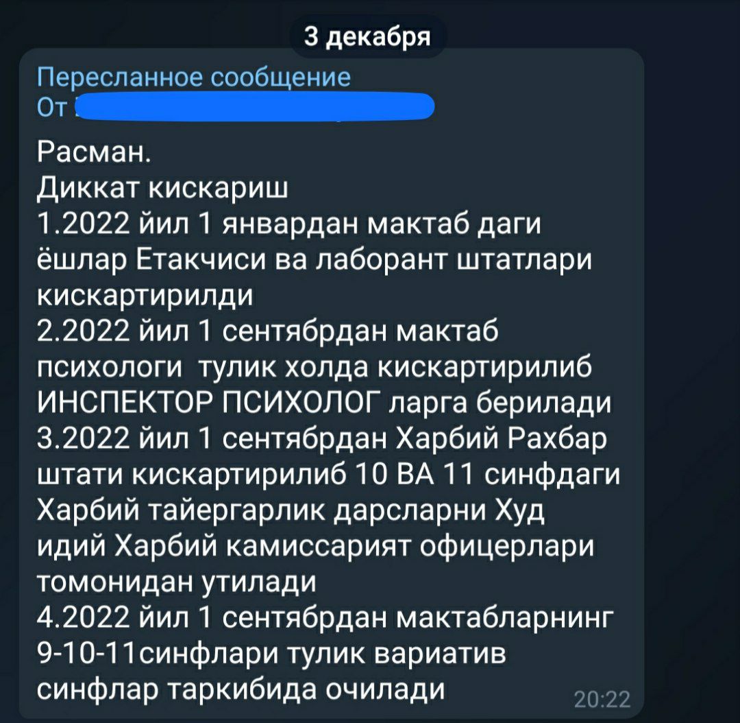 Бизга келаётган маълумотларга қараганда, ёшлар етакчиси ва психолог лавозими қисқариши муносабати билан, уларни бошқа иш билан таъминлаш бўйича мактаб директорларига топшириқ берилибди. Ундан ташқари бошқа лавозимлар қисқариши бўйича ҳам тасдиқланмаган маълумотлар тарқалган.