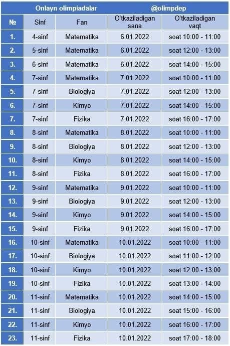 *P.S.* Онлайн олимпиадалар ўтказилиш графиги билан қуйидаги фотода танишишингиз мумкин.