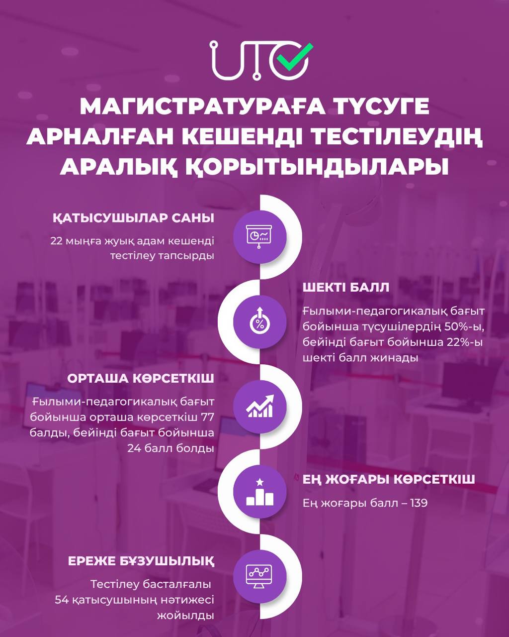 Тестілеу басталғалы 22 мыңға жуық адам магистратураға түсу үшін КТ тапсырды. Ғылыми-педагогикалық бағыт бойынша түсушілердің 50%-ы, бейінді бағыт бойынша 22%-ы шекті балл жинады. Ғылыми- педагогикалық бағыт бойынша орташа көрсеткіш 77 балды, бейінді бағыт бойынша 24 балл болды. Ең жоғары балл – 139.