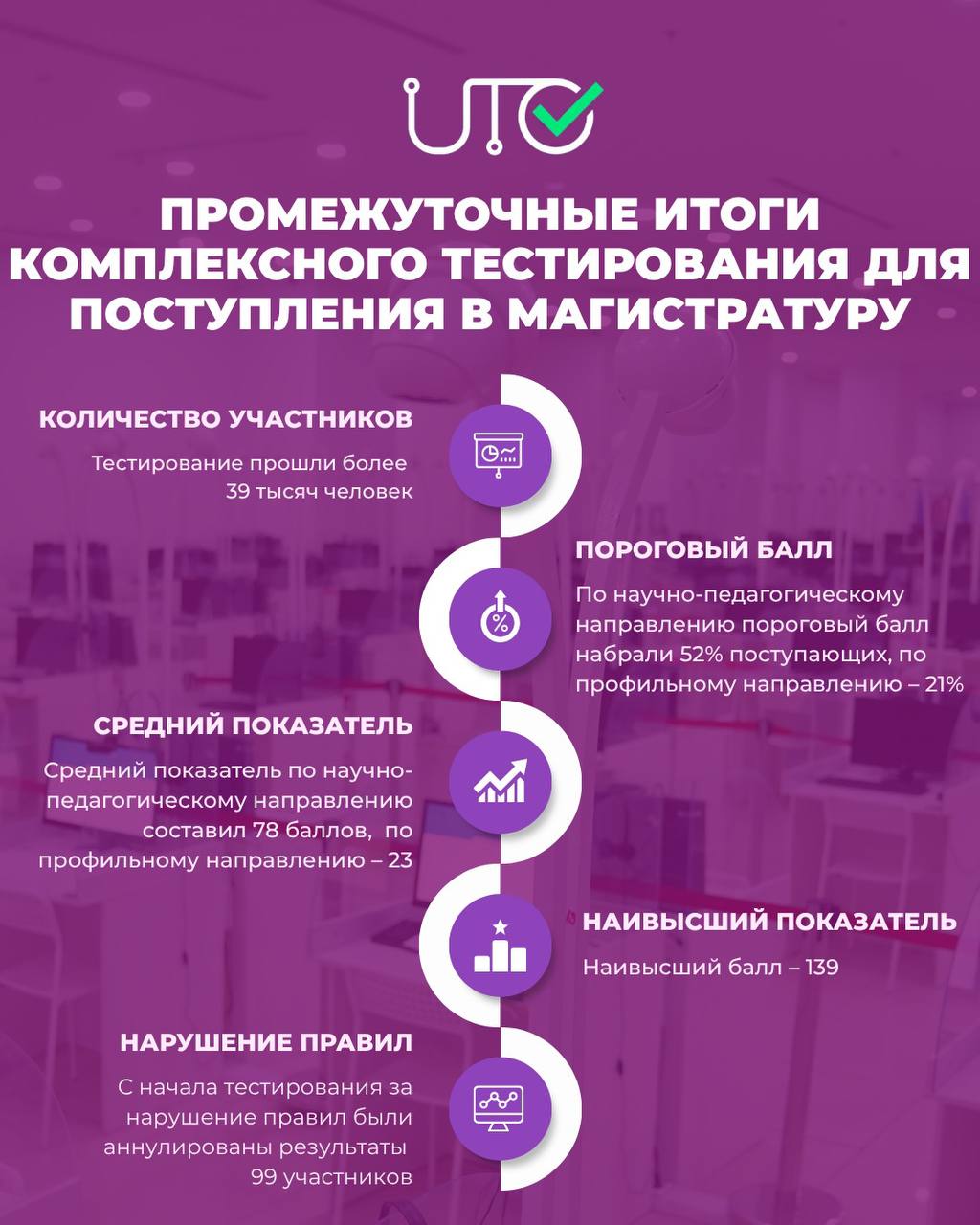 Тестілеу басталғалы 39 мыңнан астам адам магистратураға түсу үшін КТ тапсырды. Ғылыми-педагогикалық бағыт бойынша түсушілердің 52%-ы, бейінді бағыт бойынша 21%-ы шекті балл жинады. Ғылыми-педагогикалық бағыт бойынша орташа көрсеткіш 78 балды, бейінді бағыт бойынша 23 балл болды. Ең жоғары балл – 139.