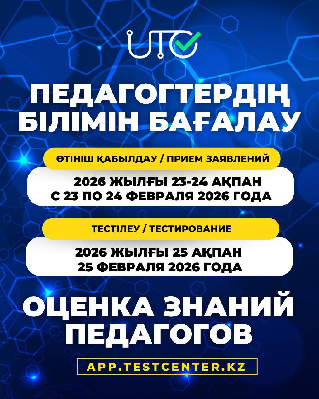 💻2026 жылғы 23-24 ақпанда аралығында app.testcenter.kz сайтында «ПЕДАГОГ» санаты үшін ПББ-ға өтініштерді қабылдау жүргізіледі.