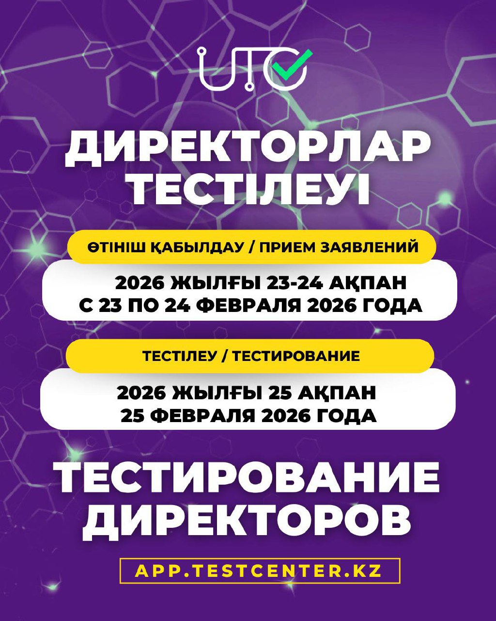 💻С 23 по 24 февраля 2026 года на сайте app.testcenter.kz будет проводиться прием заявлений на Тестирование на назначение на должность руководителей организаций образования.