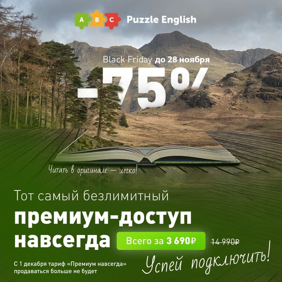 В отличие от многих, у Puzzle English наступила НАСТОЯЩАЯ чёрная пятница: премиум-доступ навсегда со скидкой 75%! Все функции сервиса по цене, которой раньше никогда не было и больше не будет. Этот тариф прекратит своё существование уже в декабре.