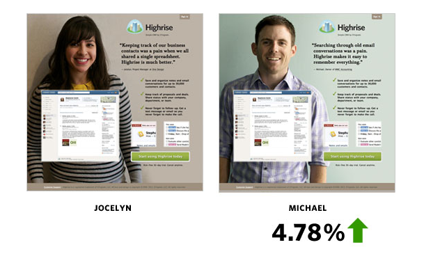 Пример: Обратите внимание на пример эффективности А/В-тестирования компании HubSpot на картинке внизу. Вариант В показал на 5% больше конверсии чем вариант А за счет другого фона и фотографии. Также можете посмотреть другие тесты.
