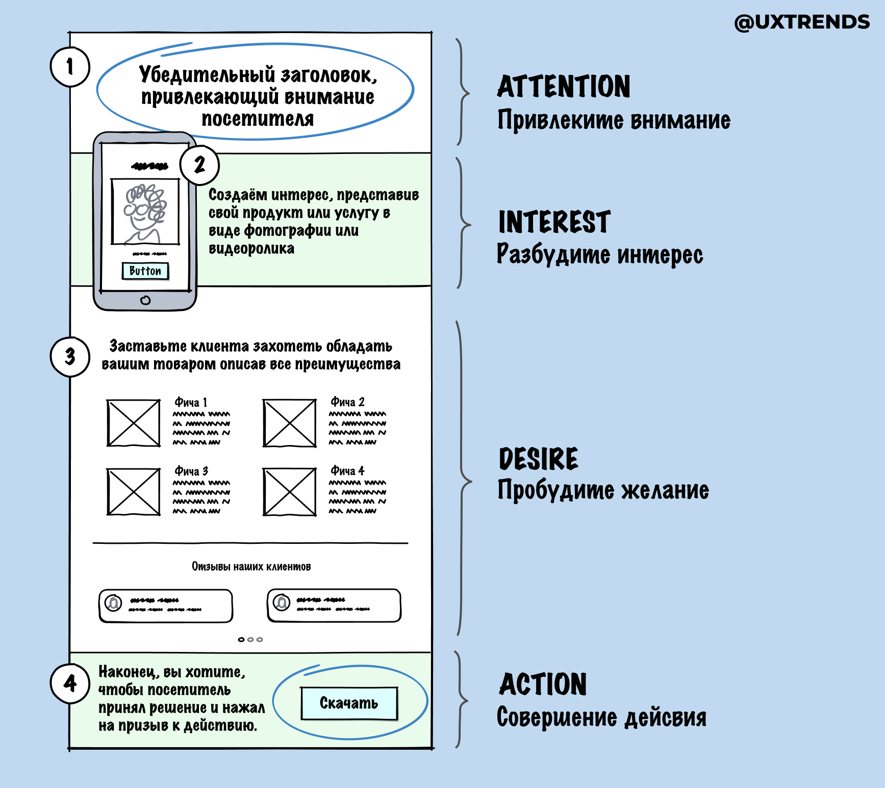 Если вы соприкасались с маркетингом, то наверняка уже слышали о классической модели потребительского поведения АИДА (акроним от англ. AIDA — Attention, Interest, Desire, Action — внимание, интерес, желание, действие). Суть состоит в том, чтобы в первую очередь привлечь внимание потенциального потребителя, затем вызвать его интерес, который перейдет в желание обладать товаром и, наконец, побудить к действию — покупке. Так это работает в рекламе и маркетинге. Разберем насколько эту модель можно применить в проектировке макета веб-страницы.