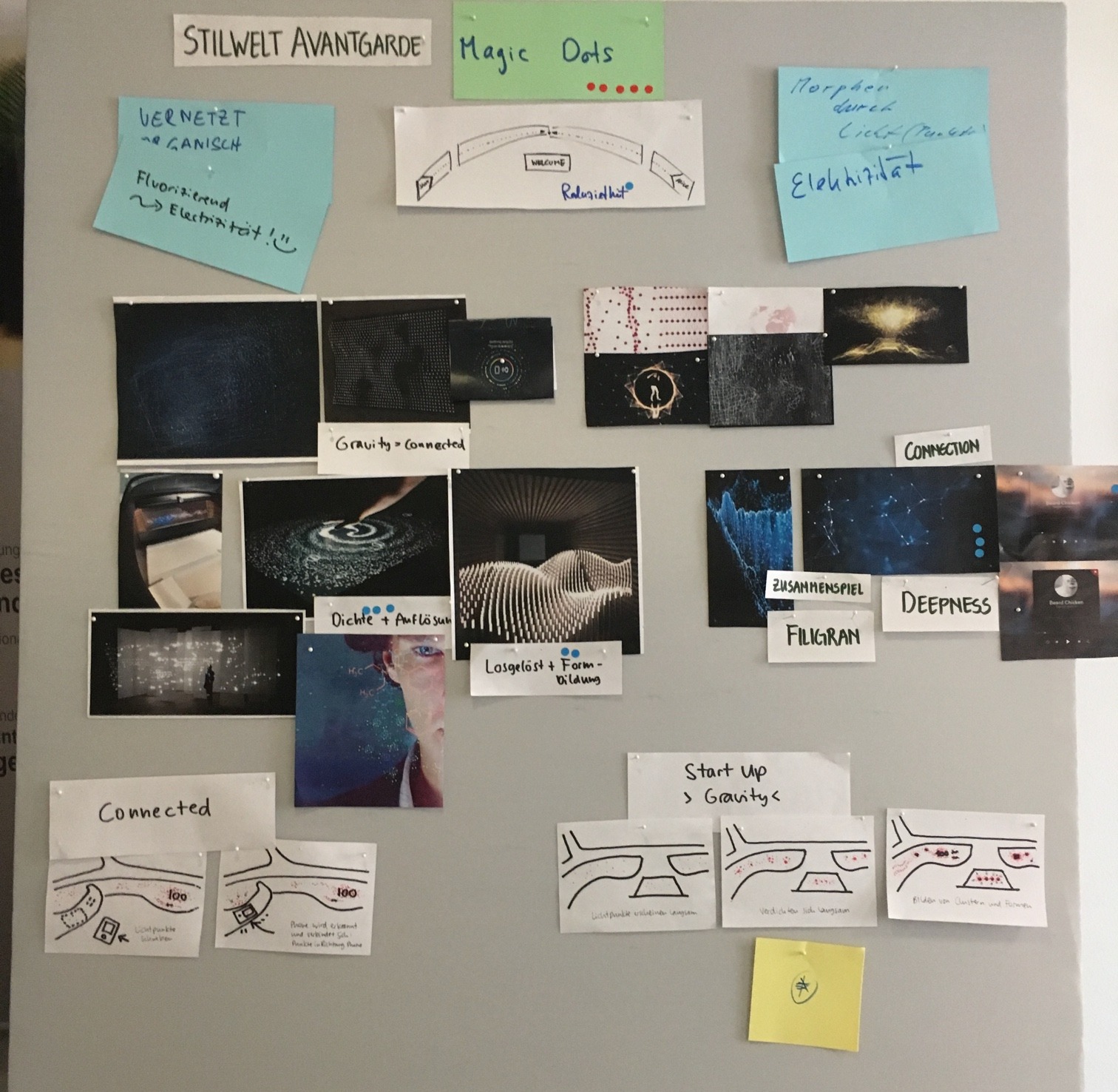 Пример мудборда для дашборда концепного автомобиля над которым мне довелось трудиться. Основная тема – светящиеся точки в пространстве формирующие элементы интерфейса.