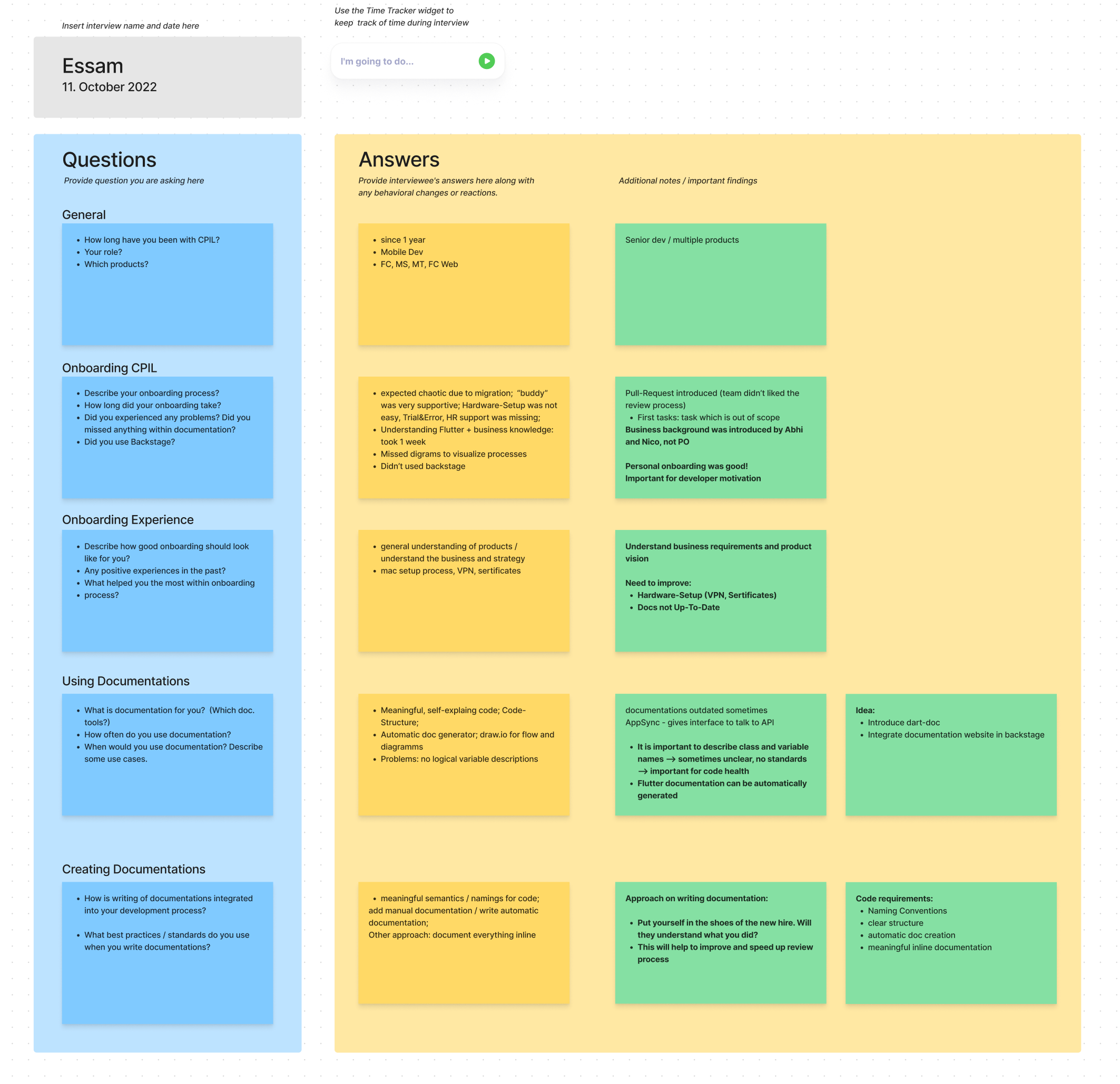 Важно не только задавать вопросы, но и документировать все ответы. Многие детали из разговора вы можете позабыть, поэтому советую проводить интервью вдвоем. Если один ведет непринужденную беседу, то напарник может спокойно конспектировать, следить за реакцией собеседника. Все вопросы и ответы мы отсортировали на доске FigJam. Далее пометили наиболее важные выводы и предложения.