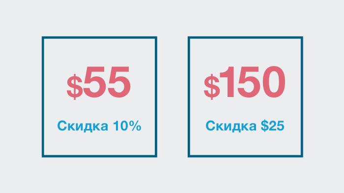 Если стоимость товара меньше 100 долларов, то скидка в процентах кажется больше. А если стоимость товара больше 100 долларов, то скидка, выраженная в долларах, кажется больше.