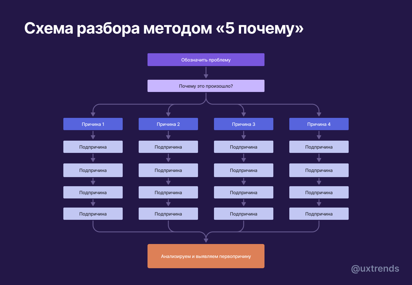 Суть метода крайне проста – она заключается в том, чтобы последовательно задавать пять "почему" с каждым вопросом приближаясь к первопричине возникновения проблемы.