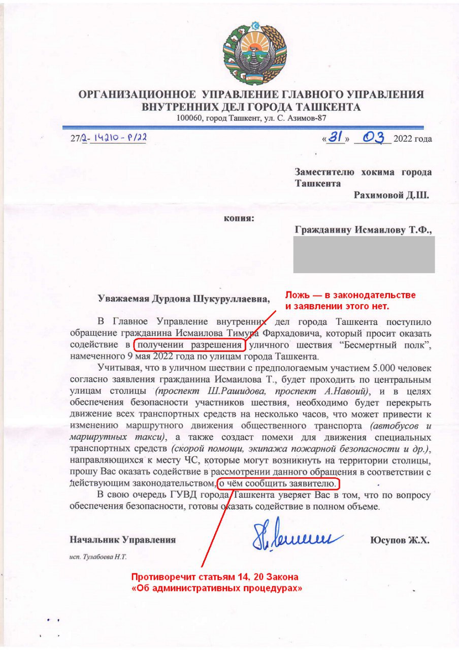 Как помним, 31 марта начальнику ГУВД г. Ташкента заявлено о проведении 9 мая 2022 года народно-патриотического шествия «Бессмертный полк» и запрошено подтвердить блокирование улиц и иных участков местности для прохождения шествия.