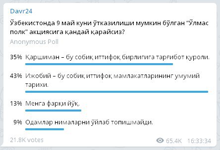 На протест главы Демократической партии Узбекистана «Миллий тикланиш» («Национальное восстановление») Алишер Кадырова о проведении акции «Бессмертный полк» в Ташкенте ответил организатор мероприятия Тимур Исмаилов 4 апреля в Telegram-канале «Бессмертный полк…