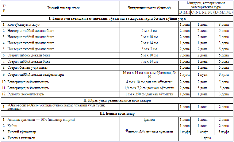 Ушбу рўйхатда миқдори, автотранспорт категориясига кўра белгиланган, ташқи қон кетишни вақтинчалик тўхтатиш ва жароҳатларга боғлам қўйиш учун тиббий буюмлар, юрак ўпка реанимацияси воситалари ва бошқа воситалар ўрин эгаллаган. (Тўлиқ рўйхат иловада.)