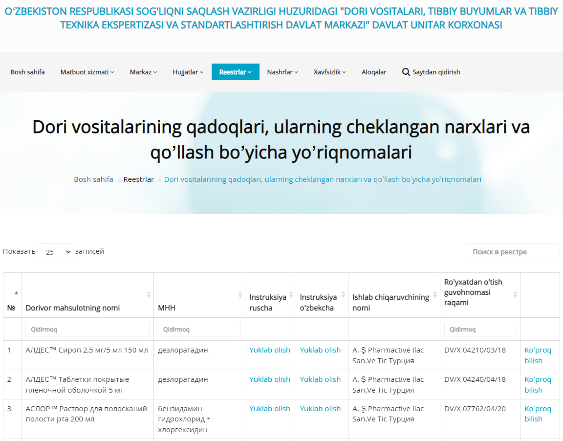 Эндиликда сиз, қуйидаги ҳавола орқали дори воситаларининг: