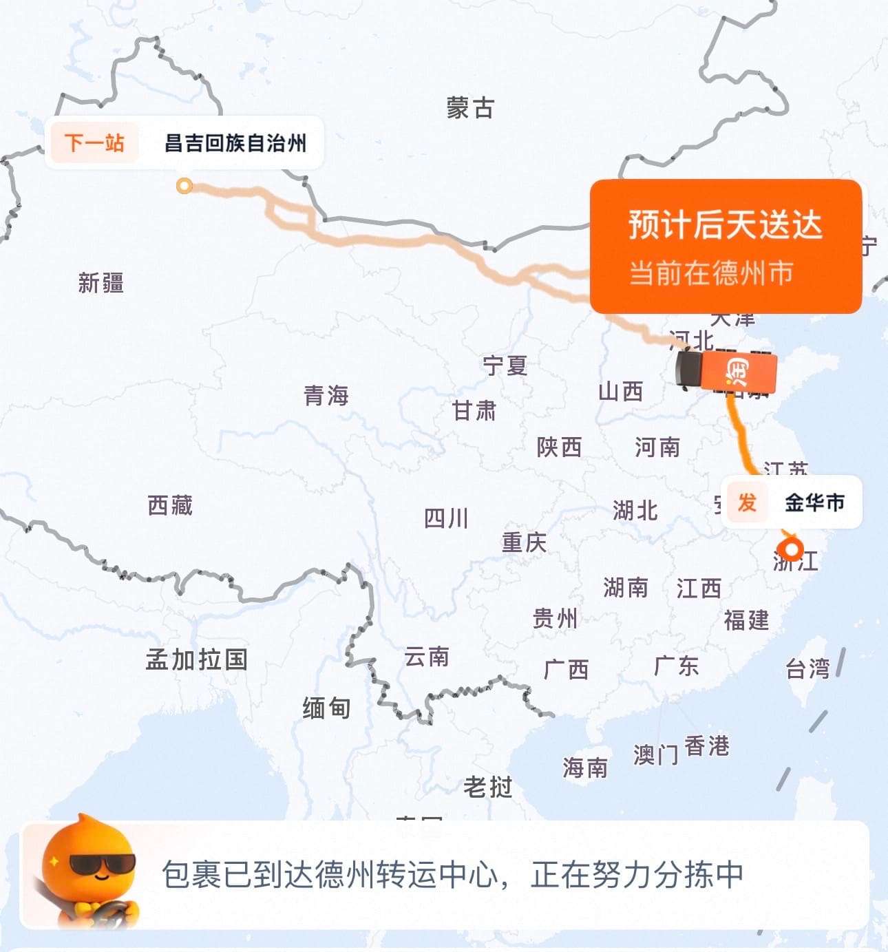 在淘宝买了个懒人沙发,从浙江金华发货,经过了两天,到了德州,我一看物流信息的下一站,惊呆了,居然是新疆!
