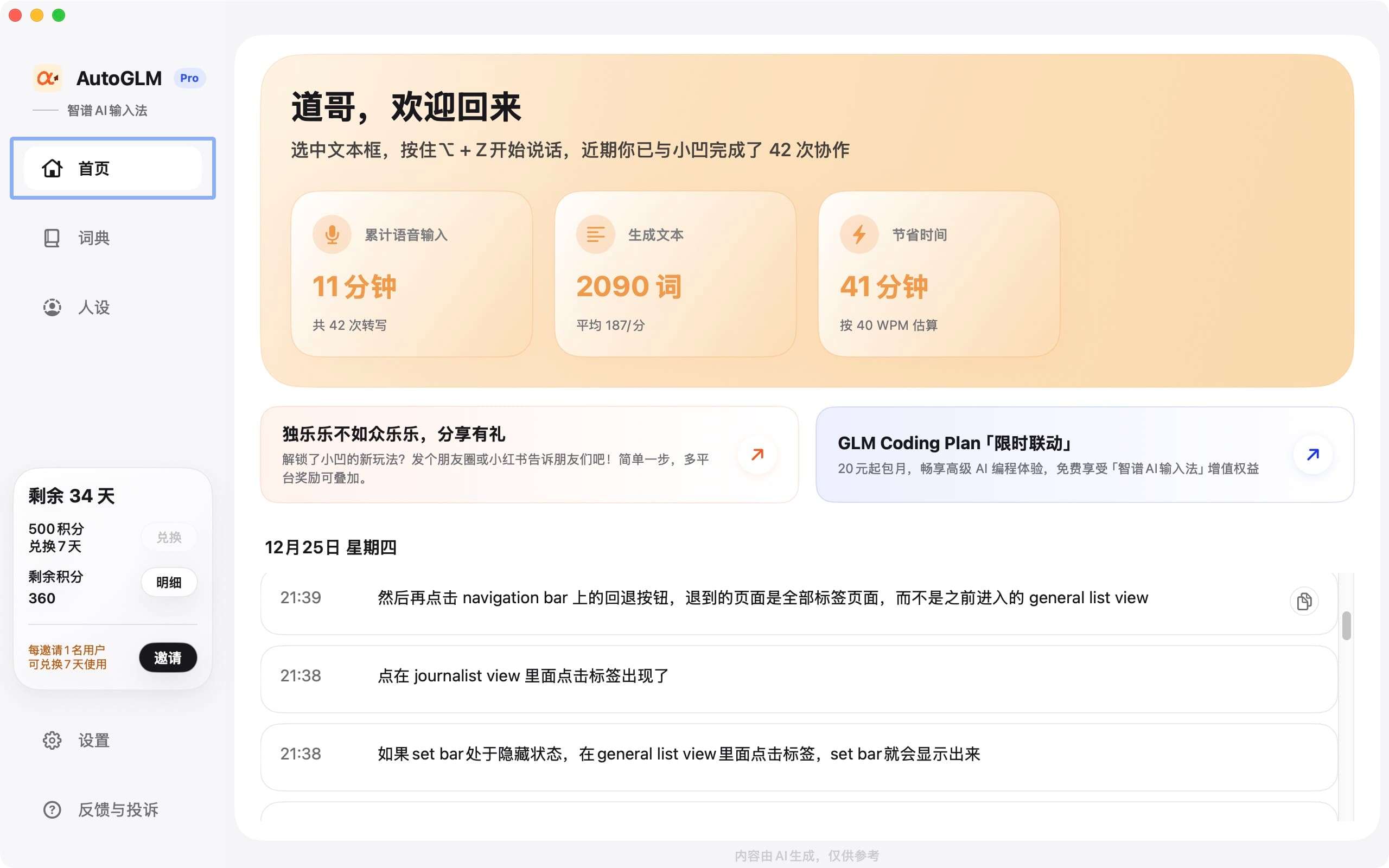 智谱 AI 输入法,用的是自家的 GLM 大模型,在线识别,速度比起闪电说要慢一些,不过也还能接受。它有一个比较有趣的人设功能,就是根据不同人设,可以直接将你说的话转换成各种不同的文本,比如说中文直接输出翻译后的英文或者根据说的内容直接生成命令行指令。不过我经常忘了切换人设,所以这个功能体验了几次就改回了默认人设。这个输入法赶工痕迹非常明显,UI 上有一些 bug 。更严重的是我第一次安装后,一打开就崩溃,根本无法使用,后来才发现是我的 Mac mini 没有录音设备,这个软件在检测不到录音源的时候就会不断崩溃……另外,这个输入法也不是免费的,不过目前还在推广阶段,通过赠送的积分可以用一阵子。