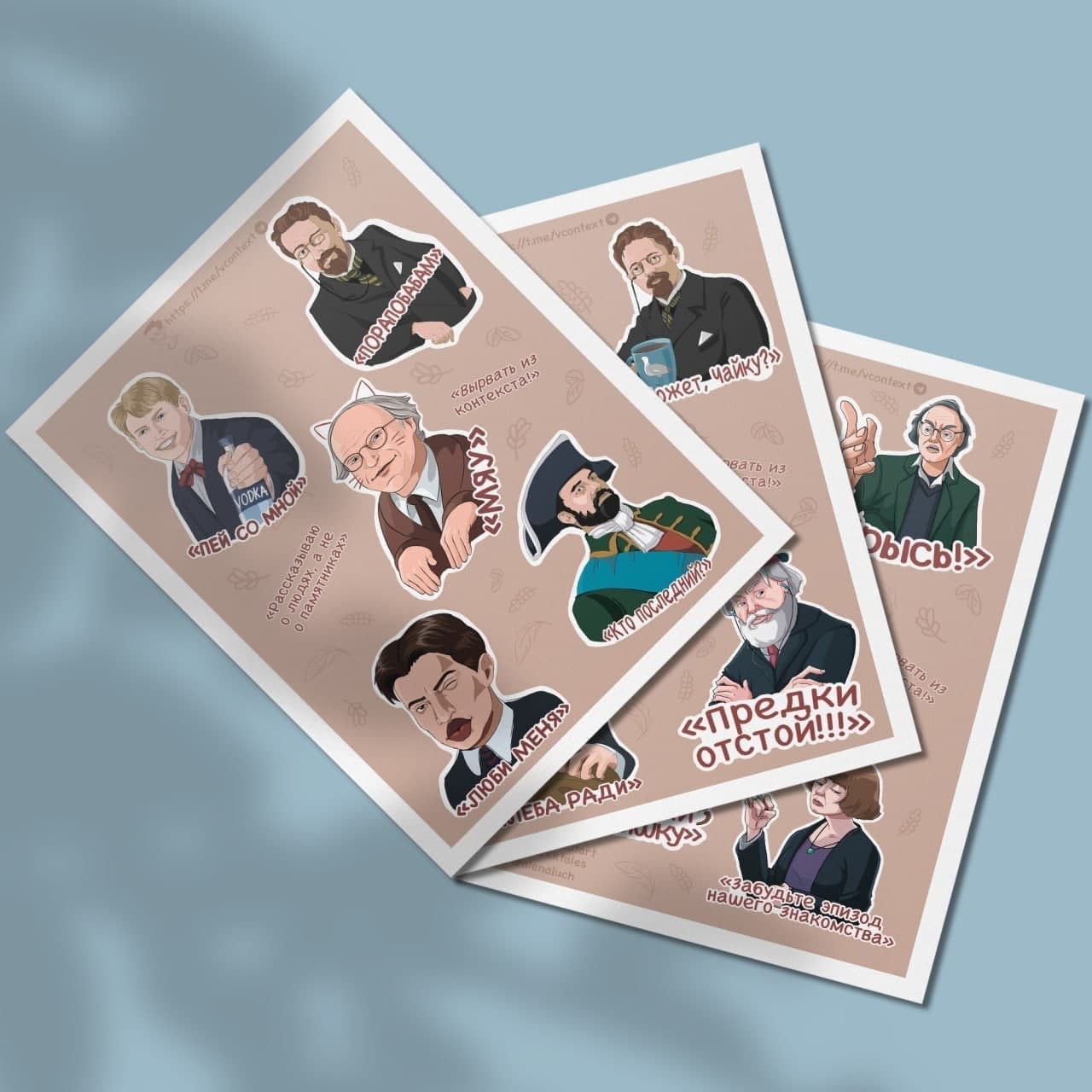 Счастье у нас есть. Это стикерпак по мотивам «В контексте» — комплект из 15 самоклеящихся стикеров с забавными изображениями русских писателей и поэтов. В общем, отличный подарок для вас, вашего друга-книголюба или учителя по литературе.