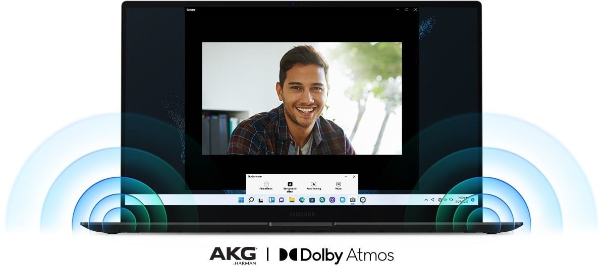 Новые ноутбуки Samsung Galaxy Book2 Pro получили широкоугольную FullHD-камеру и ряд программных улучшений для видеосвязи. Качество звука обеспечивают два микрофона с интеллектуальным шумоподавлением как со стороны пользователя, так и со стороны собеседника. Есть функция размытия фона, всевозможные эффекты для лица и автоматическое кадрирование, которое позволяет удерживать человека в центре кадра во время движения.
