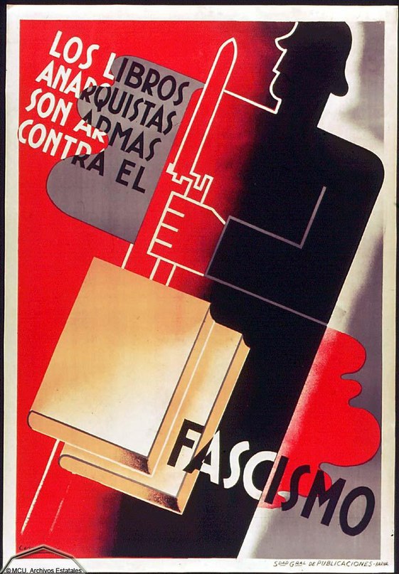 (Надпись на плакате: «анархистские книги — это оружие против фашизма»)