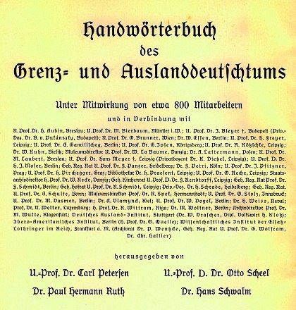 На картинке — титульная страница «Настольного словаря немецкой нации приграничных и заграничных территорий» (1933), где указано, что он был составлен при участии около 800 научных сотрудников.