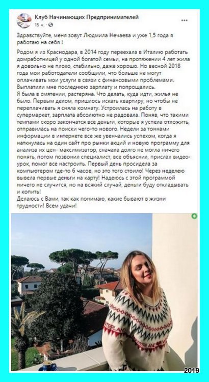 В Facebook размещена реклама, в которой женщина представляется как краснодарка Людмила Нечаева и рассказывает, как смогла разбогатеть. Это развод для заманивания в финансовый лохотрон 24news через прокладку Crisis Aid.