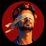 into the hair and around the blindfold—warm orange, yellow, red, and one muted blue