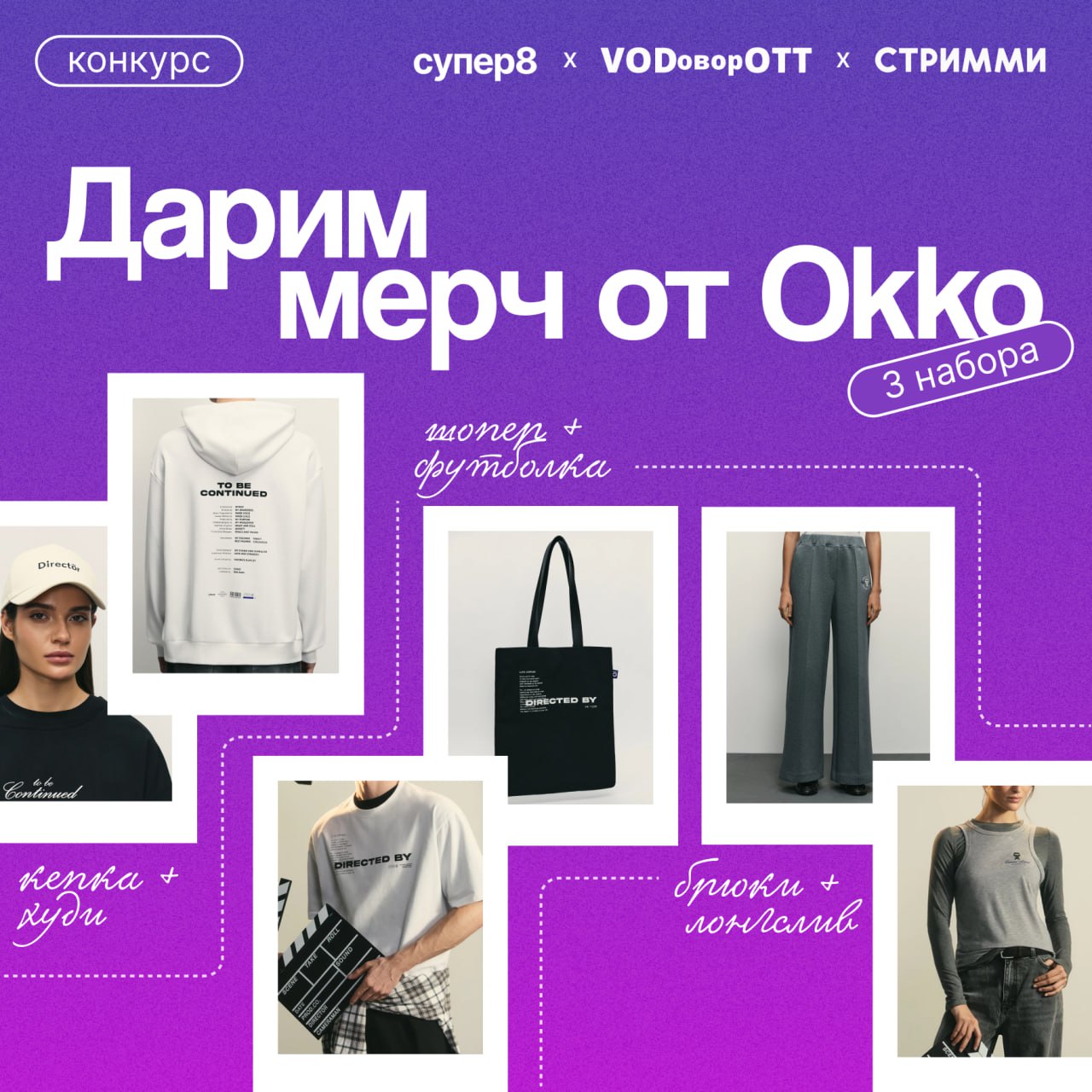 Будет три набора — и три победителя. Чтобы участвовать в конкурсе, нажмите на кнопку ниже и подпишитесь на все три канала — супер8, VODоворOTT и Стримми.