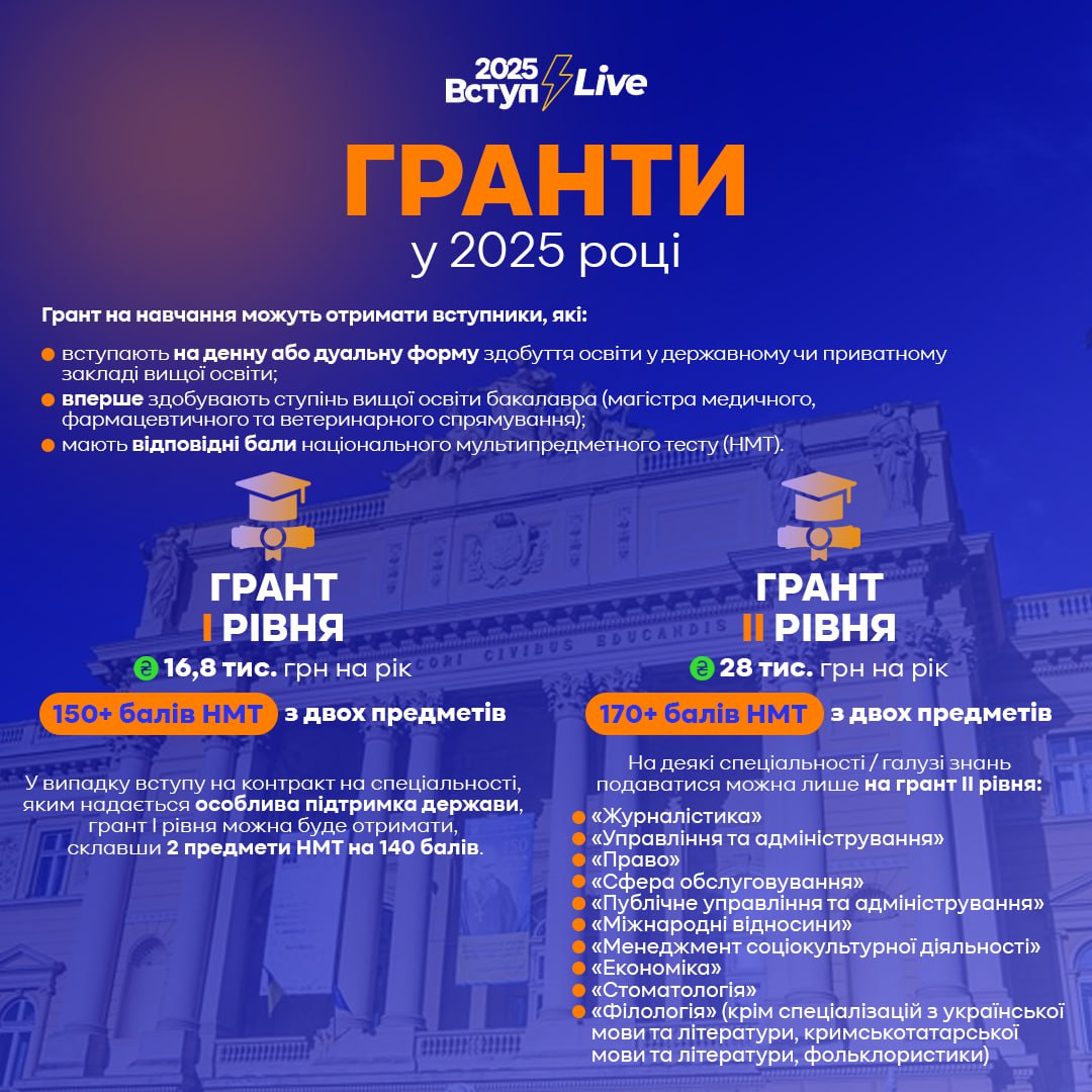 У 2025 році українські абітурієнти, які вступають на контракт, можуть скористатися державною програмою грантового фінансування.