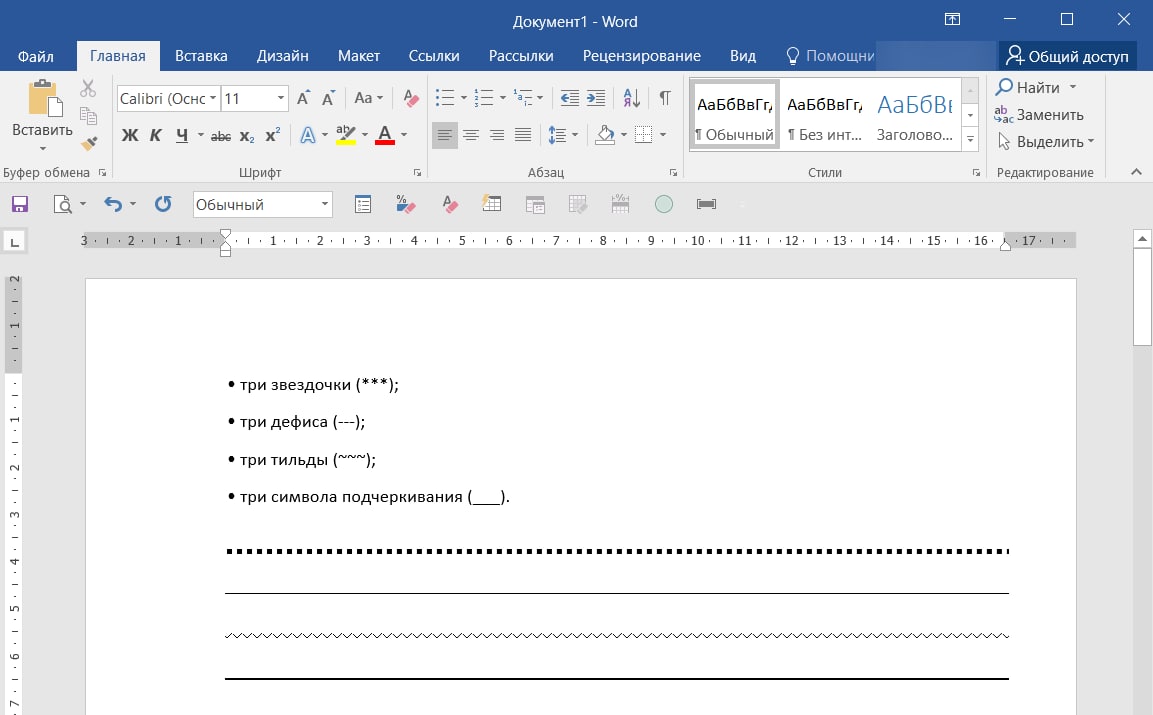 После этого следует нажать клавишу Enter. Word заменит эти последовательности символов линией определенного типа, проходящей от одного края до другого.