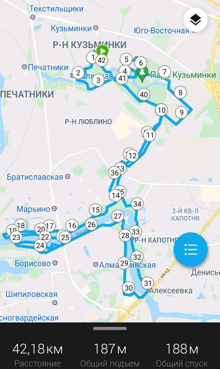 1. Кузьминки - Марьино - Братеево -Капотня - Марьино - Кузьминки (от раздевалки до раздевалки) - 42,2 км