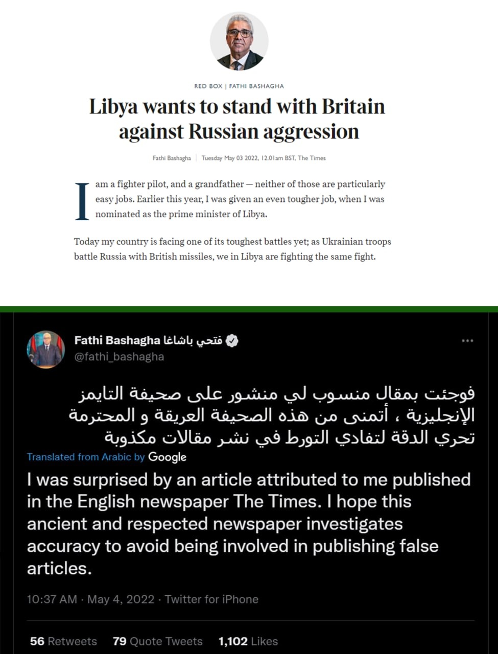 Фейк: В The Times появилась статья за авторством премьер-министра Ливии Фатхи Башага, в материале рассказывается о том, как Ливия хочет поддержать Великобританию против России.