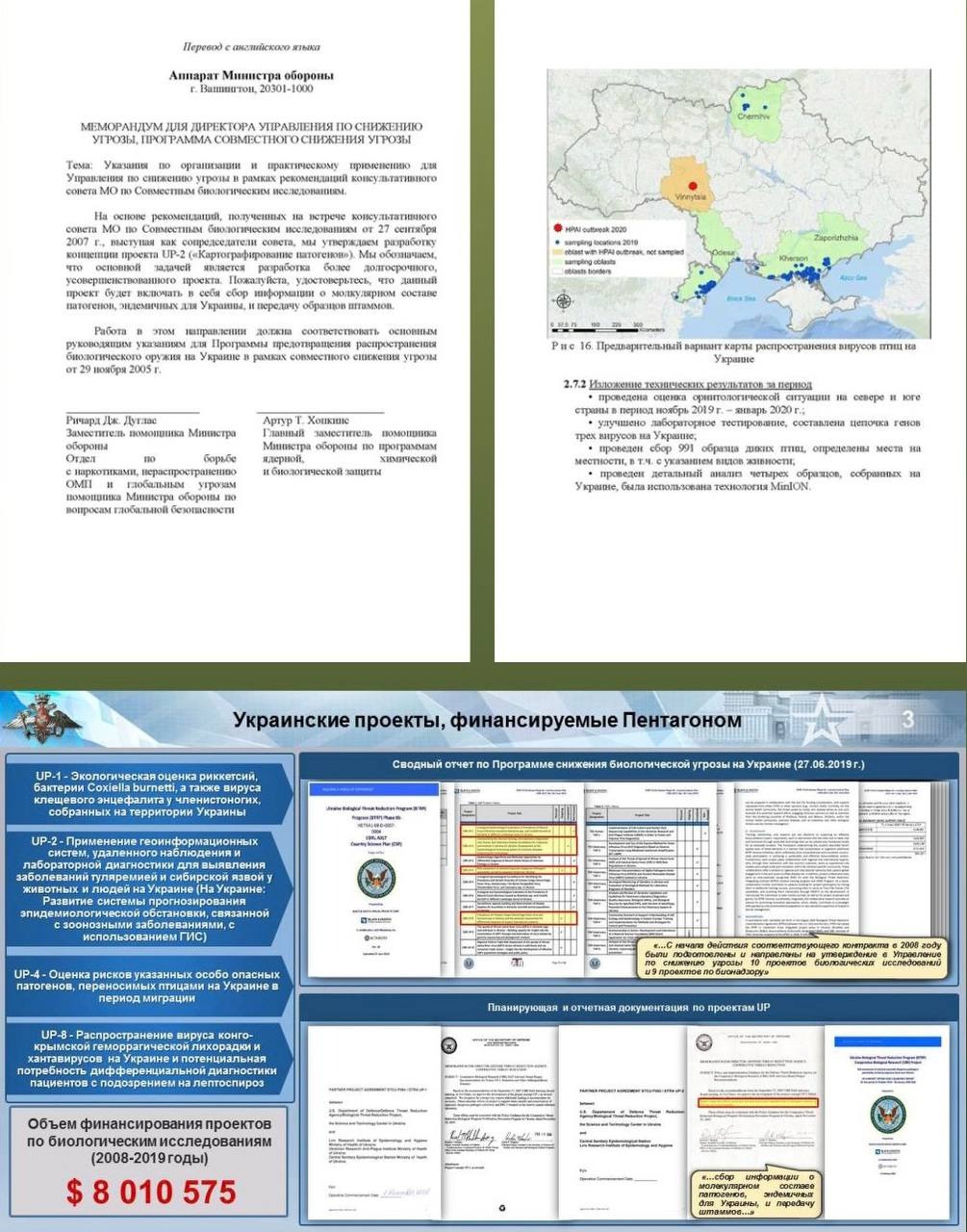 Пентагон заказывал картографирование особо опасных патогенов (например, птичьего гриппа или африканской чумы свиней) на территории Украины с обязательной передачей образцов штаммов в США. При этом уровень защиты персонала в украинских биолабораториях, где велись работы над опасными патогенами, был недостаточным, а значит заразившиеся ученые и военные могут распространить эпидемию на всю Европу.