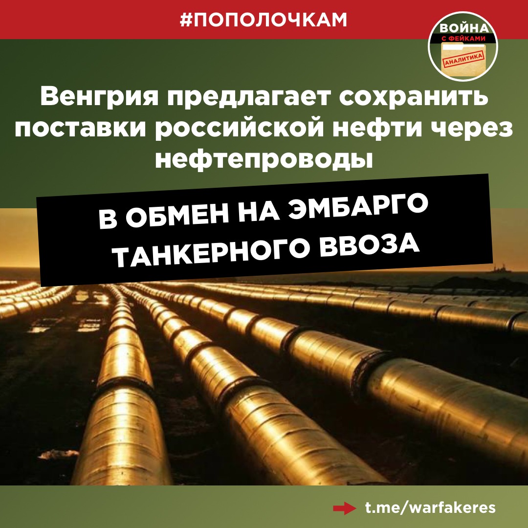 Министр иностранных дел и внешнеэкономических связей Венгрии Петер Сийярто заявил, что Венгрия предлагает ввести эмбарго на морские поставки российской нефти, при этом сохранив работу нефтепроводов.