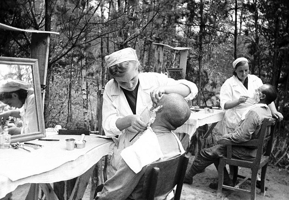 Стрижка и бритье бойцов в прифронтовой парикмахерской. Западный фронт, 1943 год