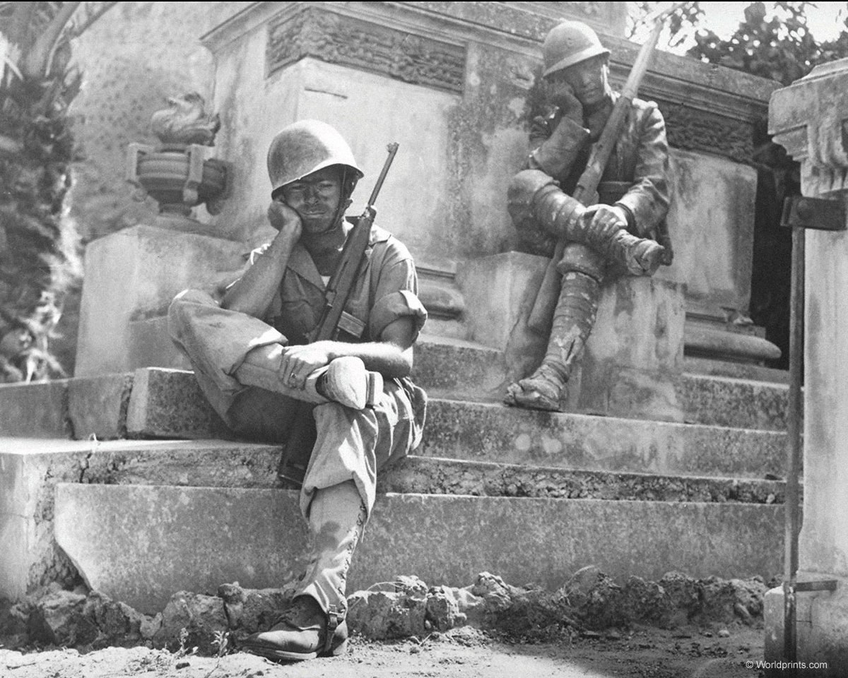 Солдаты двух мировых войн. Сержант Норвуд Дорман на фоне мемориала итальянским солдатам Первой мировой. Сицилия, 1943 год