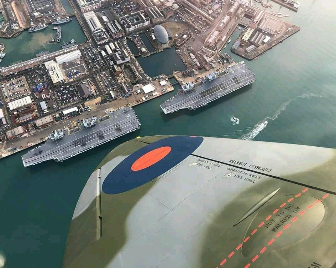 Очень британское фото. Под крылом "Спитфайра" авианосцы "Куин Элизабет" и "Принc оф Уэльс" (второй корабль серии приступил к ходовым испытаниям).