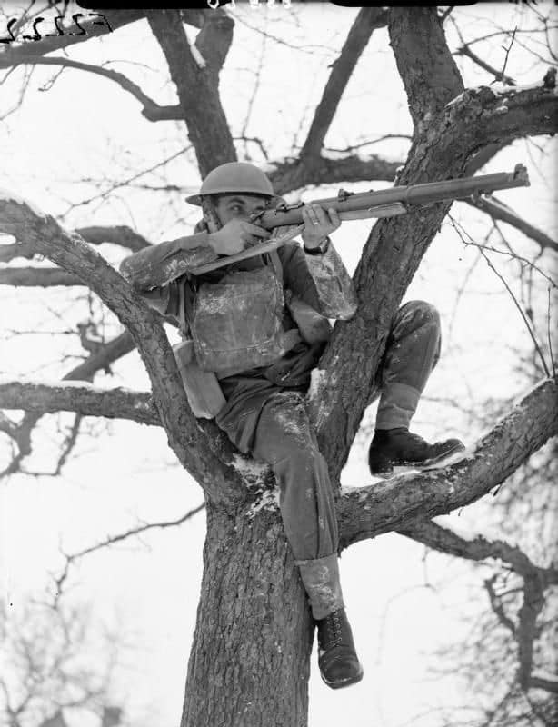 Кукушка по-английски. Солдат 2-го Уоруикширского полка целится из винтовки, сидя на дереве. Франция, Рюмежи, возле границы с Бельгией. Январь 1940 года.