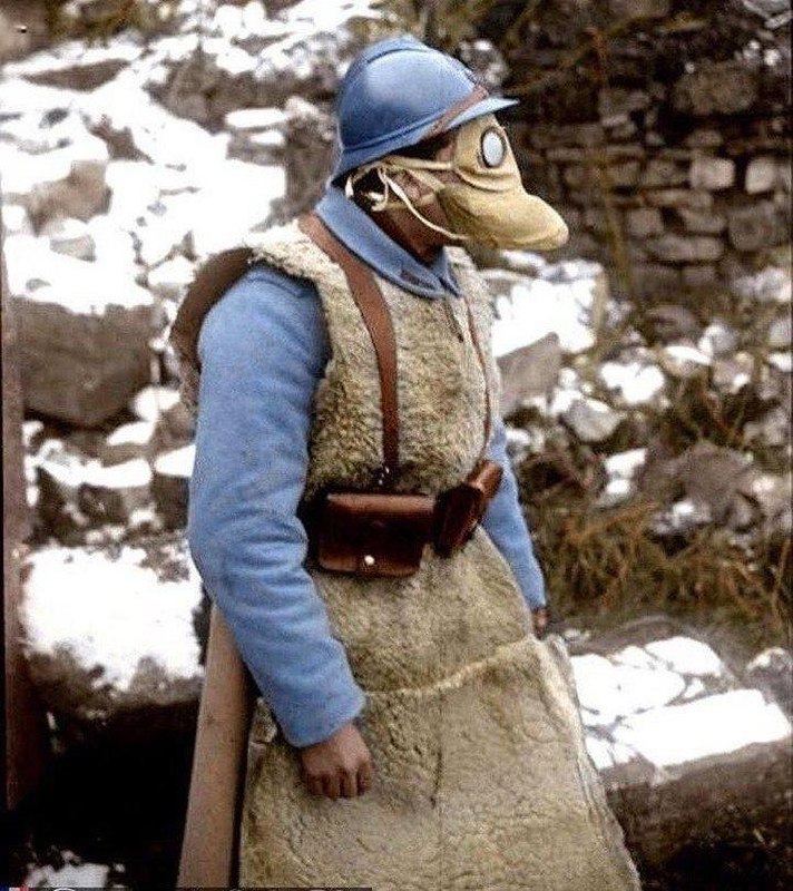 "И что-то приуныл". Французский солдат в газовой маске и овчинном жилете. Подобные "душегрейки" носили и британские солдаты, только короче. В окопах было нежарко. Постоянный холод и влажность вызвали новую напасть - траншейную стопу: https://warhead.su/2019/09/09/novaya-voyna-novaya-bolezn-chto-takoe-transheynaya-stopa-i-otkuda-ona-vzyalas