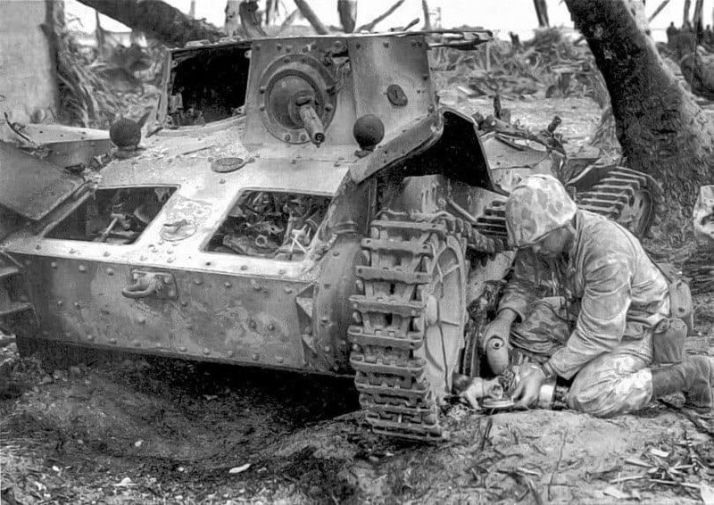 Американский морпех поит котёнка, спрятавшегося под японским танком «Ха-Го». Атолл Тарава. Высадка на Тараве стала первой операцией по прорыву японского островного оборонительного периметра в Океании и далась американцам непросто: https://warhead.su/2019/02/20/atoll-tarava-pervyy-blin-poamerikanski