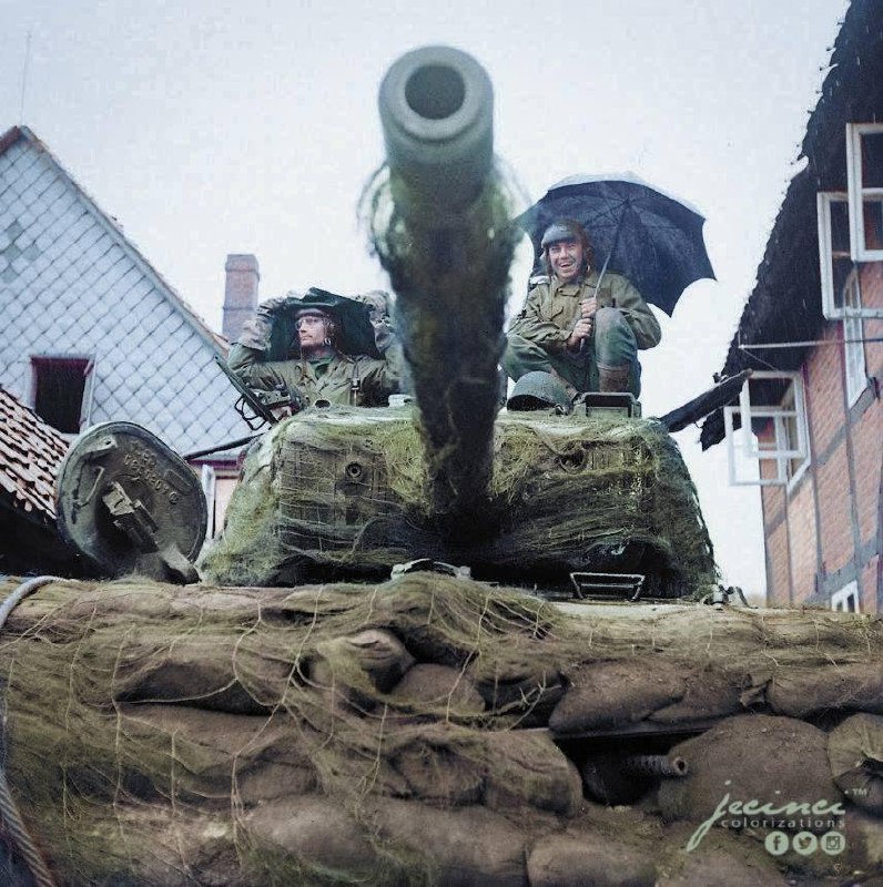 "Шербурские зонтики". "Шерман" с мешками в качестве дополнительной брони и его командир с зонтиком для защиты от непогоды. Германия, апрель 1945 года.