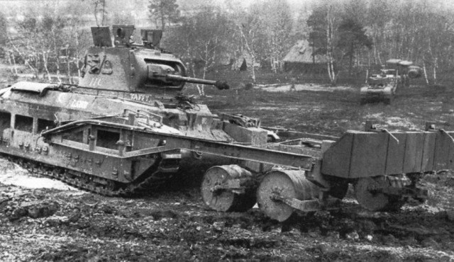 Британский танк "Матильда II" c катковым минным тралом. Танки-тральщики англичане активно использовали в Северной Африке. Как броня воевала с минными полями