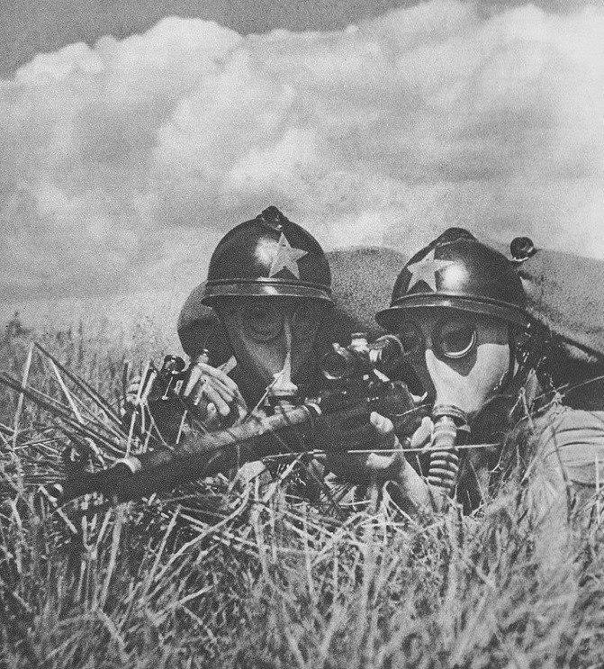 Красноармейцы в противогазах на учениях. В 20-30-е годы считалось, что в будущей войне будет обязательно применяться химическое оружие. Как видел газовую войну будущего в своем произведении красный командир - в нашем материале: https://warhead.su/2019/02/12/gazovaya-ataka-na-moskvu-glazami-krasnogo-komandarma