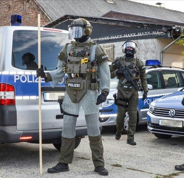 Природа очистилась - возвращаются доспехи! Боец полицейского спецназа Германии особенно внушительно смотрится в бронежилете и каске поверх длинной кольчуги. Их используют при задержании преступников с холодным оружием.